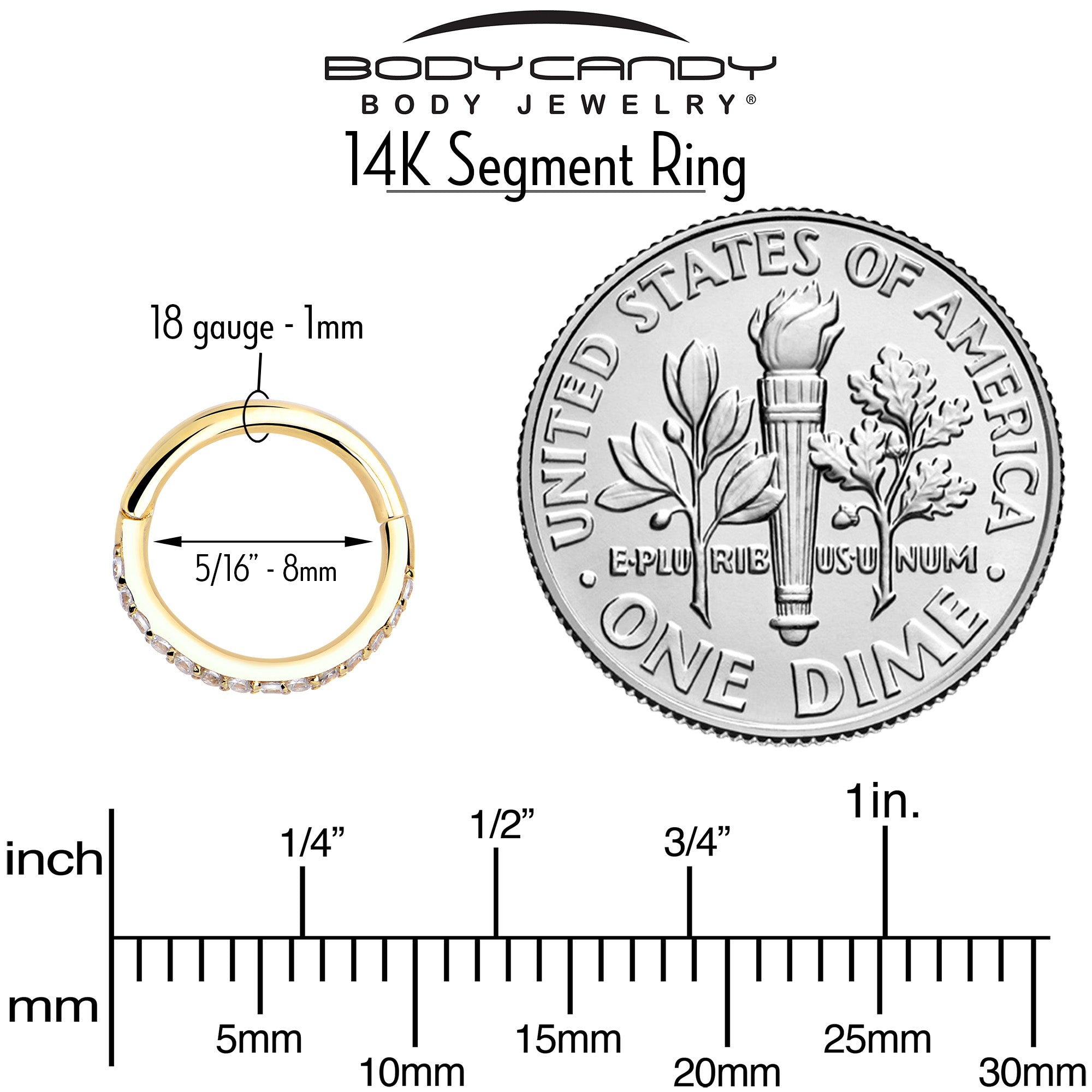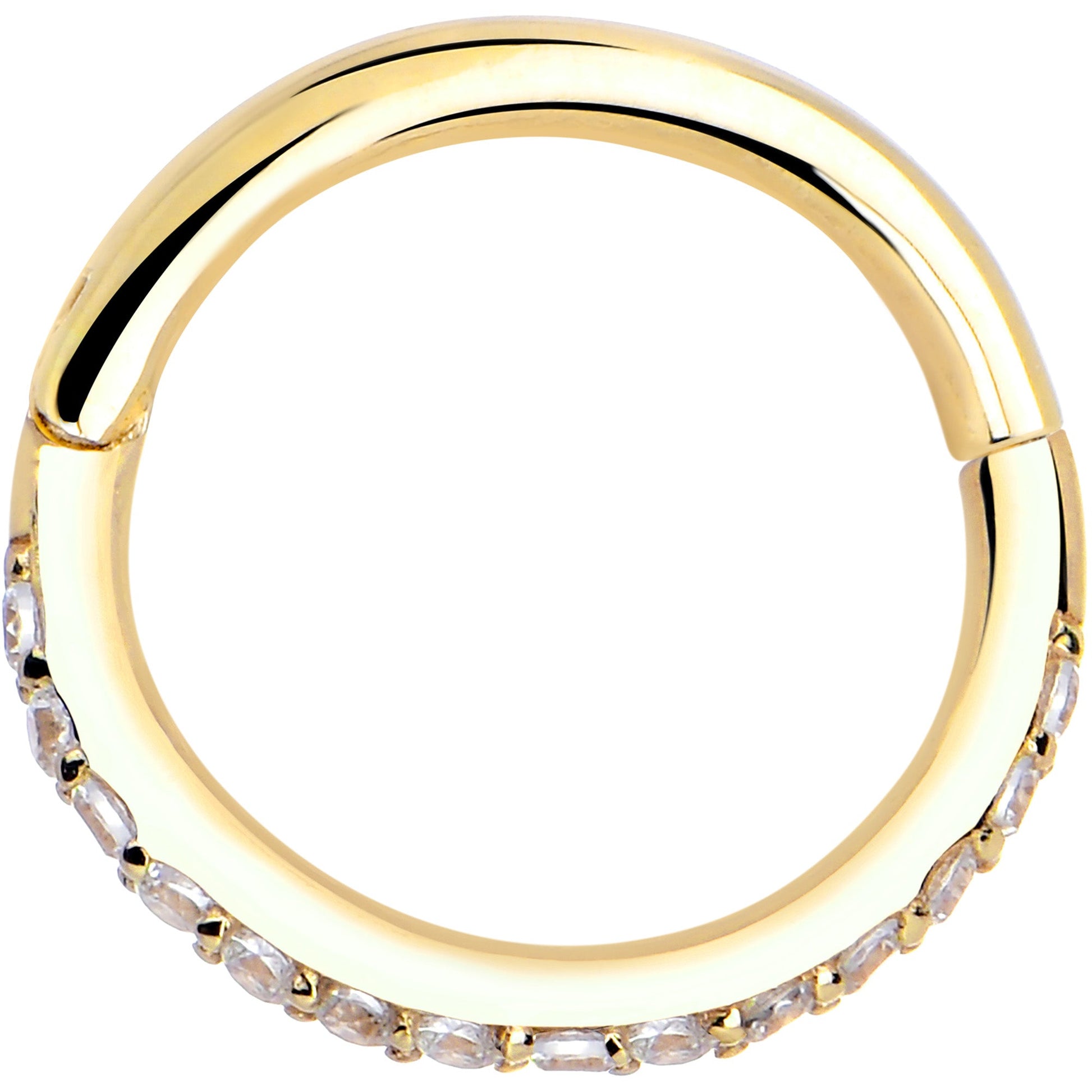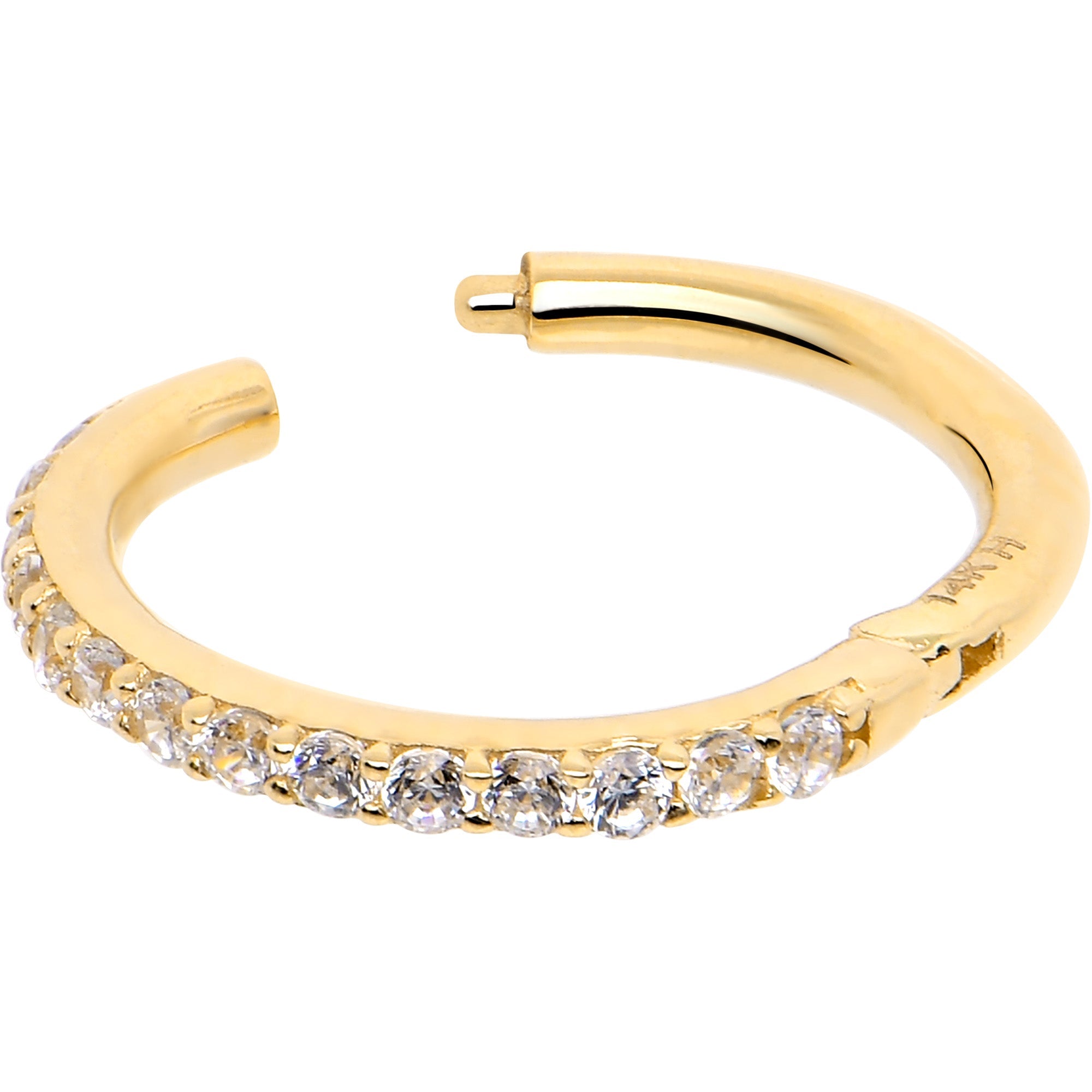 Want to show off your high-fashion style in every aspect of your look? Then this 18 gauge solid 14k yellow gold hinged circular ring is exactly what you need for a pierced look you can be proud of. It features a forward facing row of clear cubic zirconia gems for classic style you can really show off. This 8mm lip ring also features a non-removable, hinged segment that makes insertion and removal a breeze and you can rock it in multiple piercings including tragus, helix, some conch, and some nostril piercings. Ta-da! Solid gold style for you and your cartilage piercing.