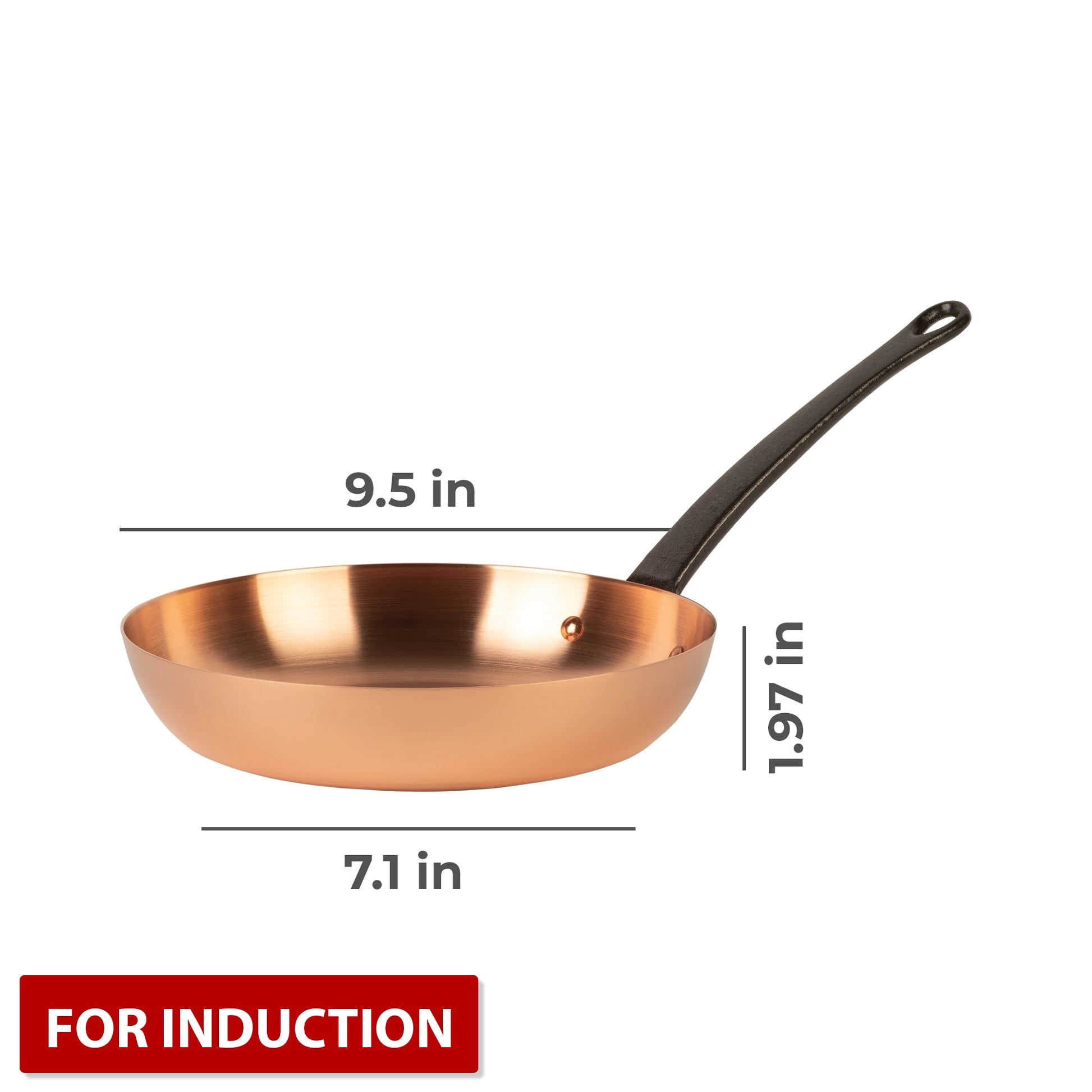 The copper frying pan for induction stoves is formed from a solid copper disc and weighs 3,3 lbs. The top diameter is 9.5 inches and the bottom diameter is about 7.1 inches. The height to the edge of the pan is 1.97 inches. With the cast iron handle, the pan is about16.3 inches long.