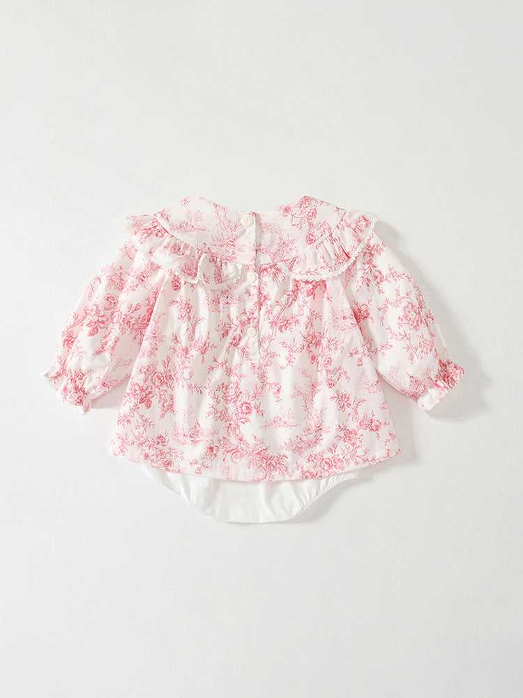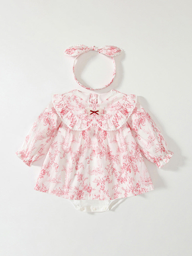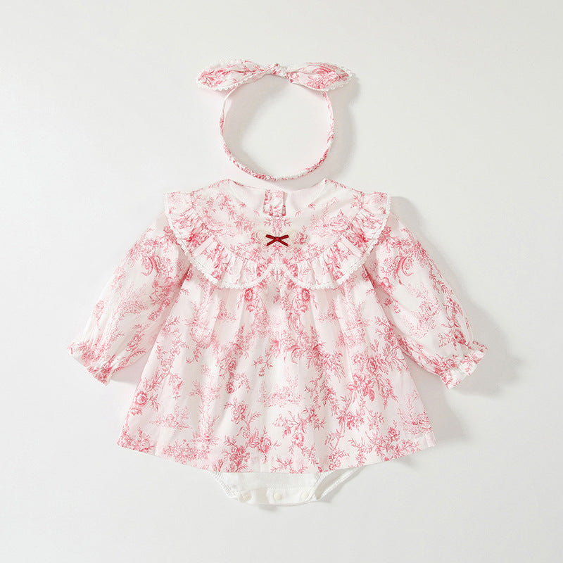 Introducing our Spring Arrival Baby Girls Onesies Dress, adorned with delicate flowers pattern and lace-trimmed Peter Pan collar. A charming addition to your little one's wardrobe, providing both style and comfort. Dress them up in this exclusive, luxurious piece and watch them bloom like a flower.