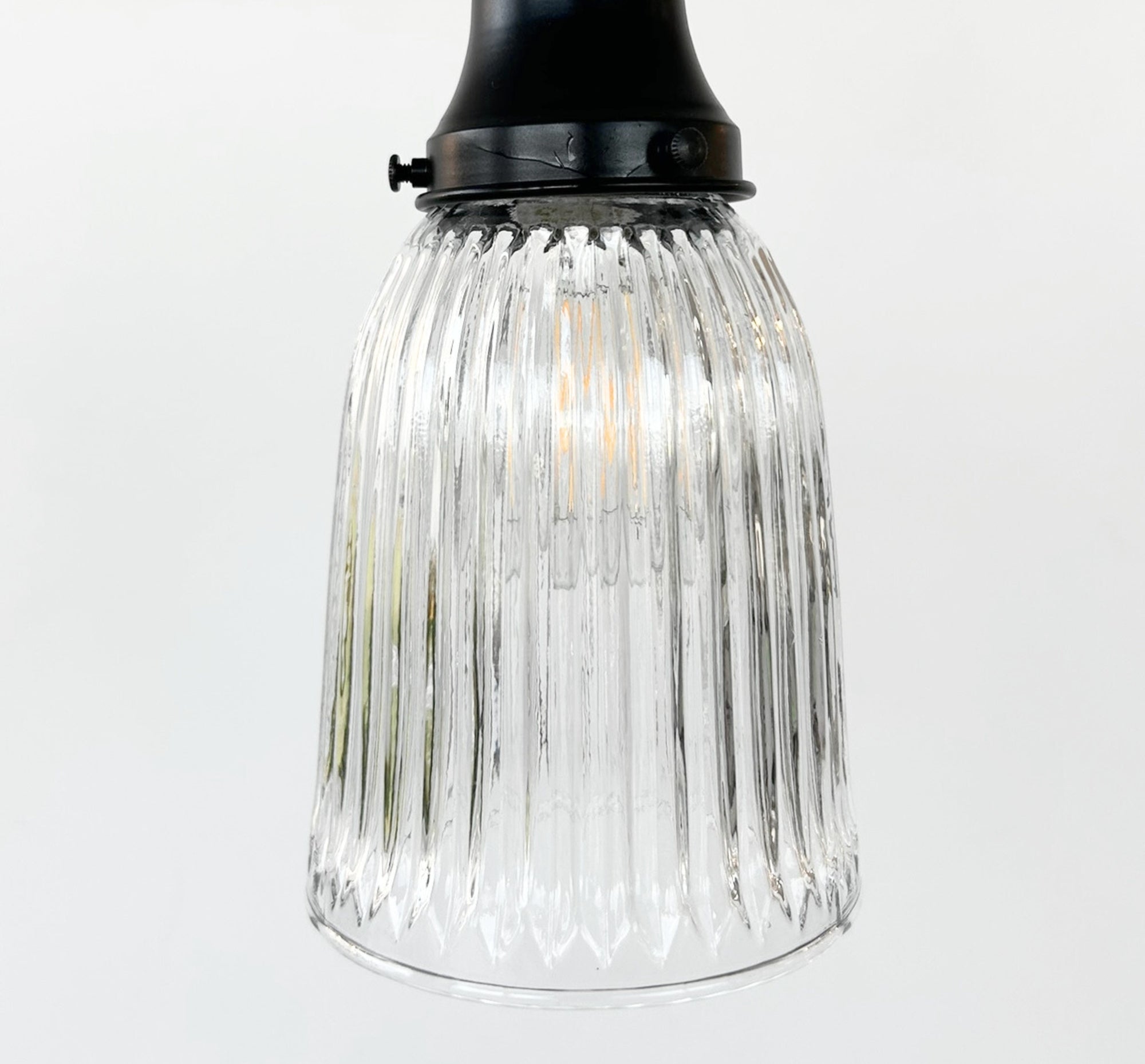 Add timeless elegance to your home with this Tall Holophane Antique 1940’s Pendant Light. Featuring a tall ribbed glass shade and vintage-inspired hardware, it casts a warm, prismatic glow perfect for kitchens, dining areas, or entryways. Shop The Lamp Goods for handmade, vintage-style lighting crafted in the USA.