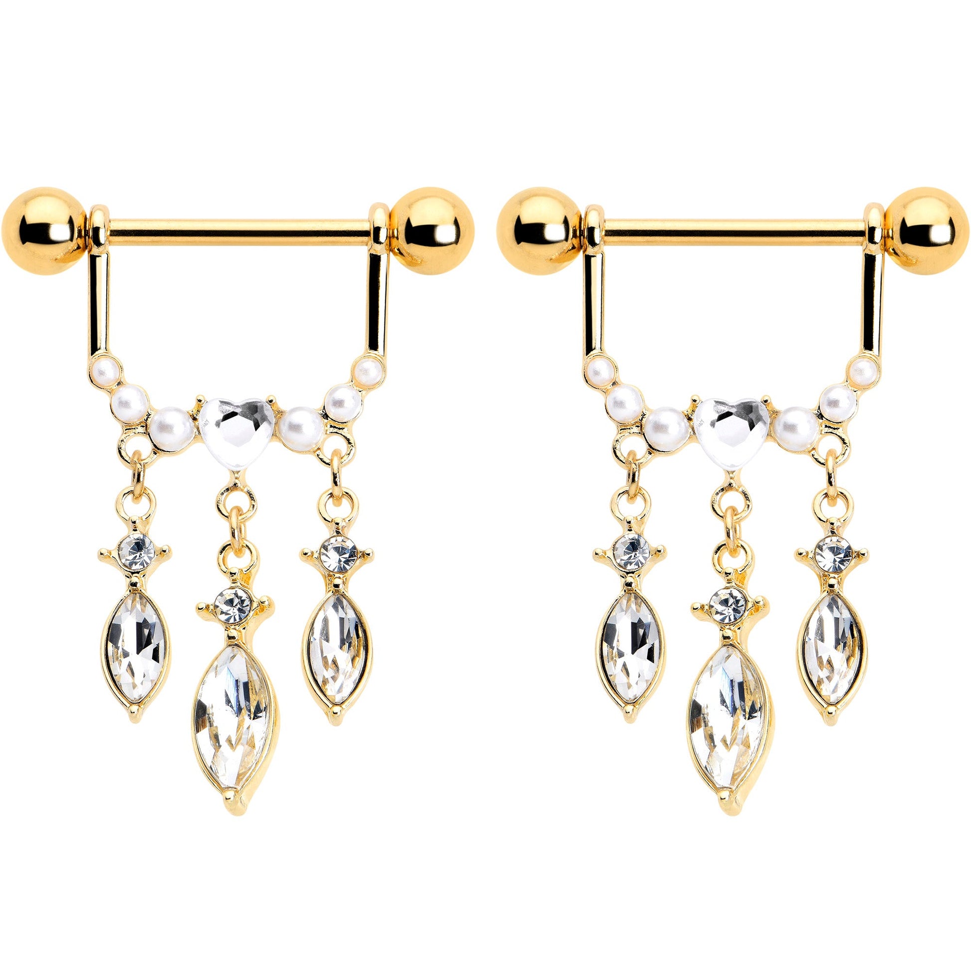 Triple the impact with this super luxe 14 gauge nipple jewelry. It's made with 14mm gold tone plated over 316L surgical grade stainless steel straight barbells with 5mm ball ends. Each one supports a row of of faux pearls with a clear gem heart in the center. Hanging beneath is a triple row of drop-shaped clear gem dangles. Turn up the volume on style with these ultra opulent nipple piercing rings. Sold as a set of two.