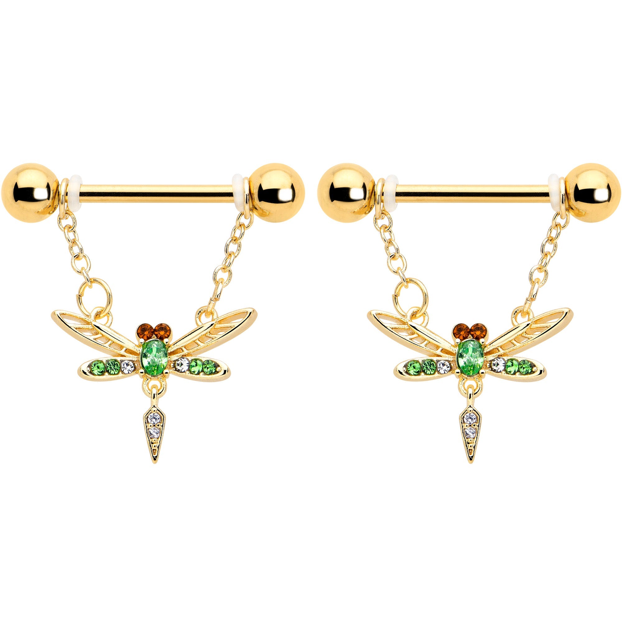 Product Details14 Gauge 9/16 Green Gem Gold Tone Swank Dragonfly Dangle Nipple Ring Set The delightful dragonflies on...
