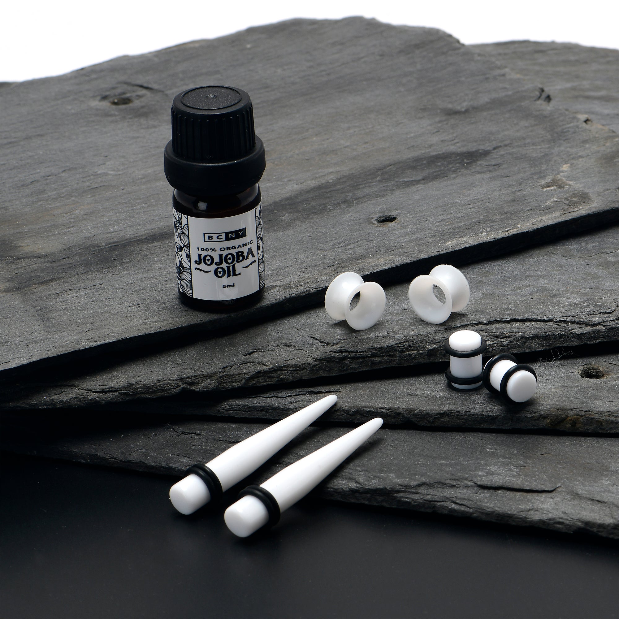 14 Gauge to 1/2 White Acrylic 54 Piece Ear Stretching Kit with Jojoba Oil