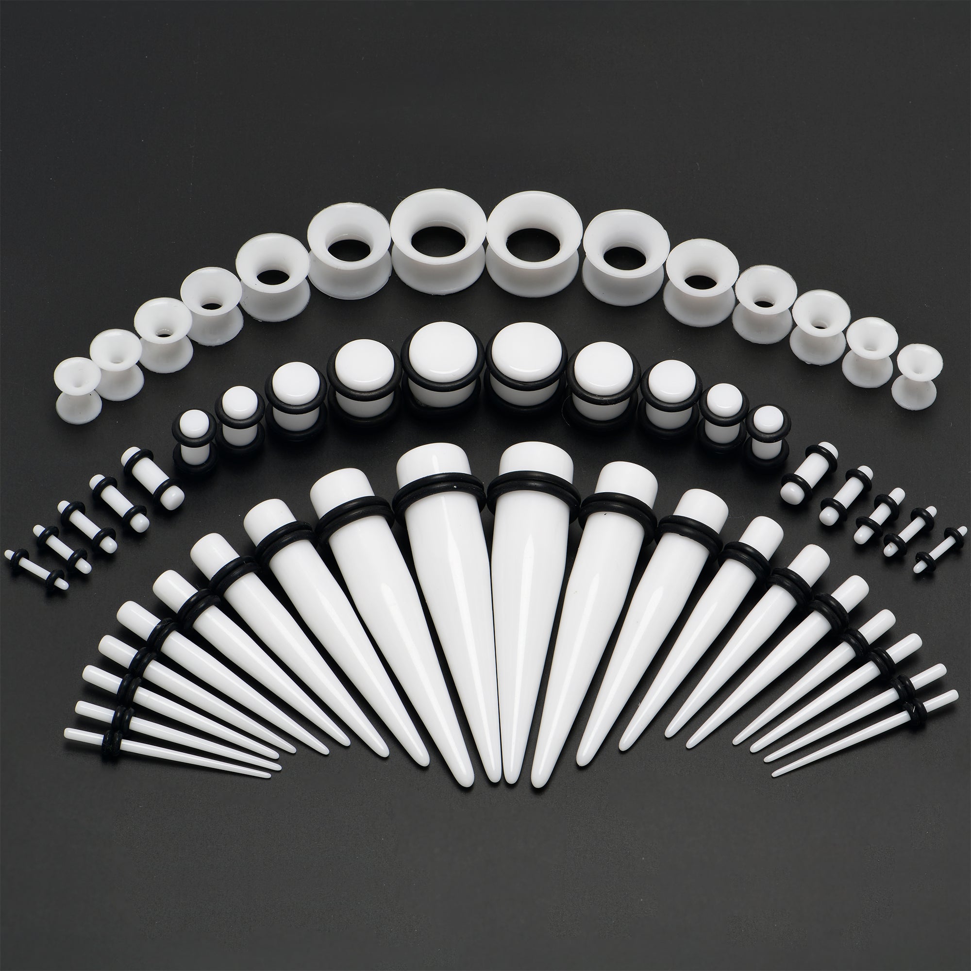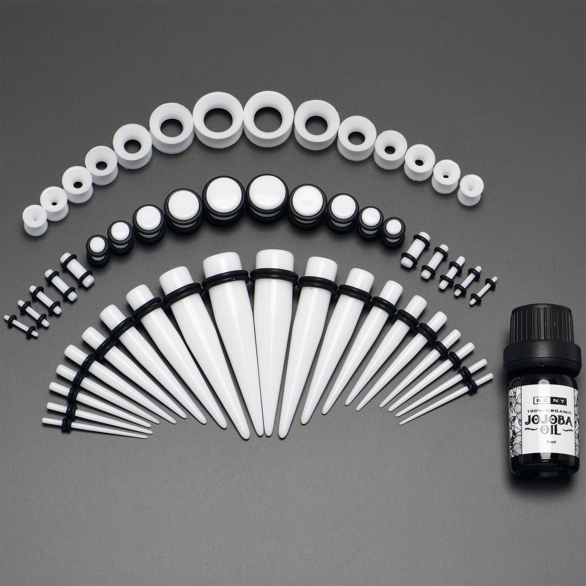 54 Total Pieces; includes 1 set of Each Size and a 5ml bottle of Natural Jojoba Oil. Acrylic Plugs and Tapers (w/rubber O-Rings) 14 Gauge (1.6mm), 12 Gauge (2mm), 10 Gauge (2.5mm), 8 Gauge (3mm), 6 Gauge (4mm), 4 Gauge (5mm), 2 Gauge (6mm), 0 Gauge (8mm), 00 Gauge (10mm) and 1/2" (12mm); Silicone Tunnels 8 Gauge (3mm), 6 Gauge (4mm), 4 Gauge (5mm), 2 Gauge (6mm), 0 Gauge (8mm), 00 Gauge (10mm) and 1/2" (12mm)