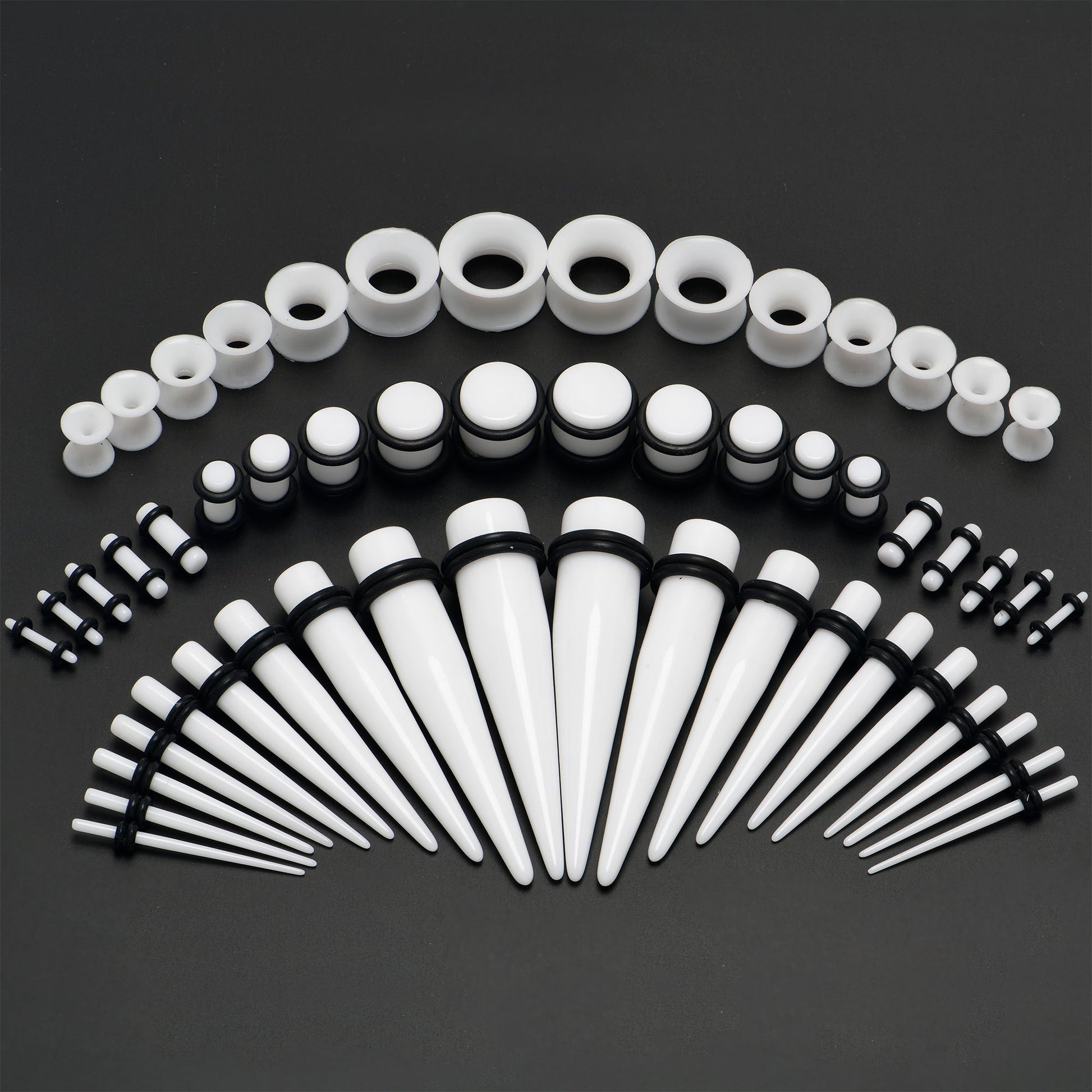 Big Value Pack: The set includes Acrylic Plugs and Tapers (with O-rings), and Silicone Tunnels in various sizes: 14G (1.6mm) to 12mm (1/2"). Silicone tunnels are double-flared and come in sizes 8G to 12mm. All pieces are the same color.