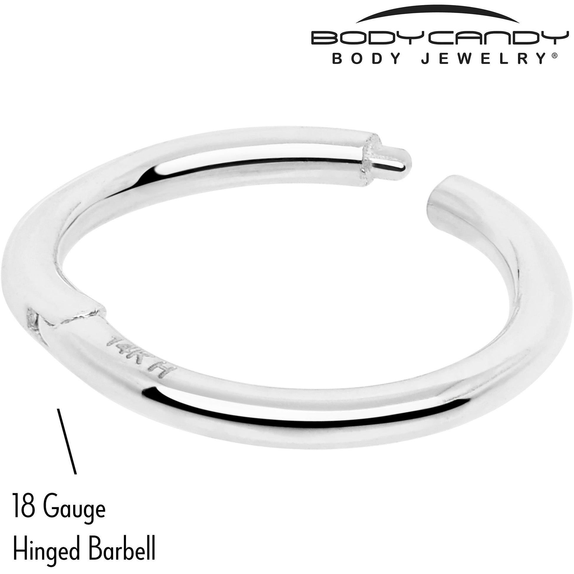 Want to show off your high-fashion style in every aspect of your look? Then this 18 gauge solid 14k white hinged circular ring is exactly what you need for a pierced look you can be proud of. It features a highly polished finish for classic style. This 8mm septum ring also features a non-removable, hinged segment that makes insertion and removal a breeze and you can rock it in multiple piercings including tragus, helix, some conch, and some daith piercings. Ta-da! Solid gold style for you and your cartilage piercing.