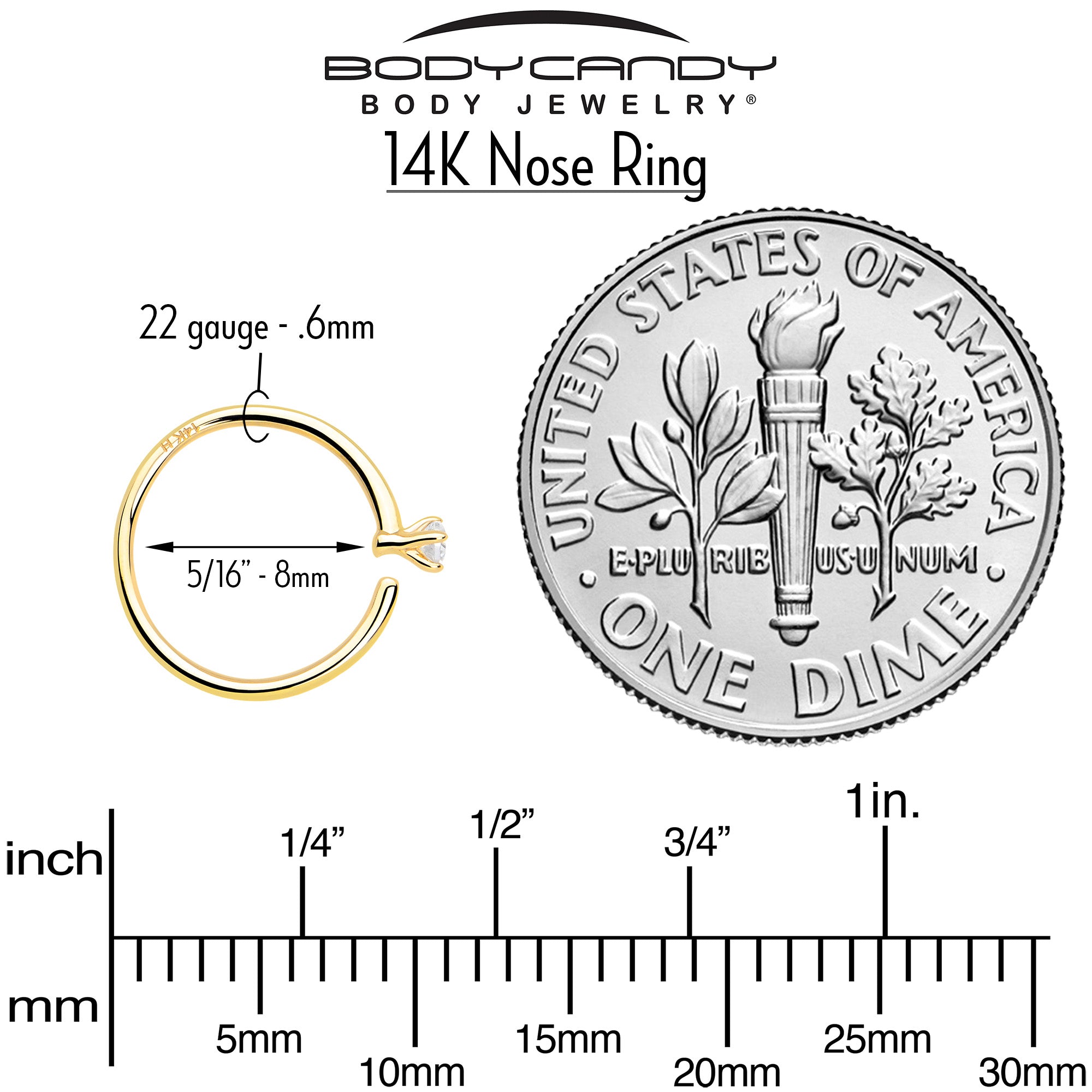 Want to show off your high-fashion style in every aspect of your look? Then this 22 gauge solid 14k yellow gold nose hoop is exactly what you need for a pierced look you can be proud of. It features a 1.5mm clear cubic zirconia gem for classic style. Bendable nose hoops are easy to wear and provide a classic look with minimalist style for suitability for countless looks. Simply open by gently pushing the wire in opposite directions to maintain the shape. Then insert the opening of the 8mm diameter hoop through the nostril and twist and turn carefully through your piercing and push ends gently back together. Ta-da! Solid gold style for you and your nose piercing.