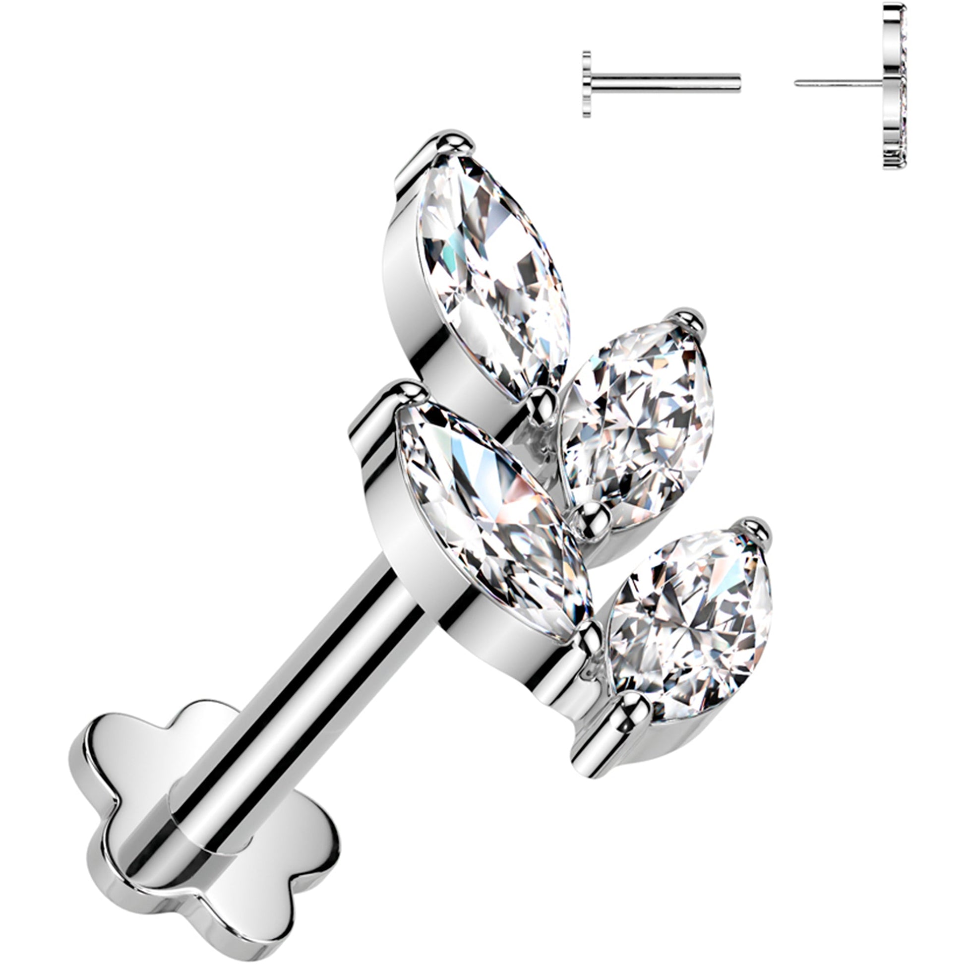 You won't want to leave this 18 gauge lip ring! It's made with an 8mm ASTM F-136 implant grade titanium straight post. The front end features a vine with four leaves, set with clear cubic zirconia gems and featuring a threadless design that makes insertion and removal a snap. The back end features a flower shape, for a charming change from the standard disc shape and you can wear it reversed for twice the style. You can even rock this jewelry in multiple piercings including lip, monroe, tragus, helix, and some conch piercings. With such an endearing style and such thoughtful details, this flat back earring is one you'll fall in love with.