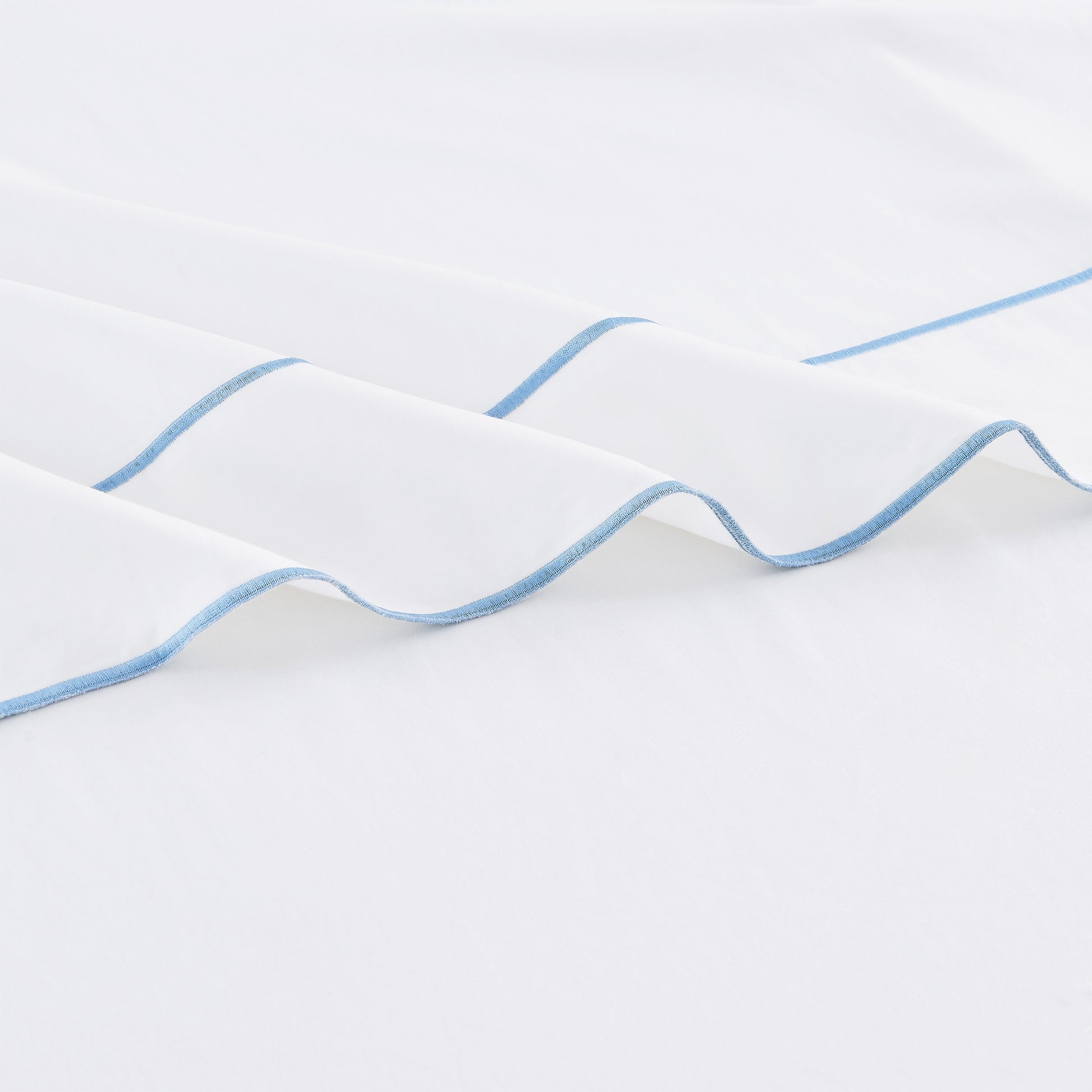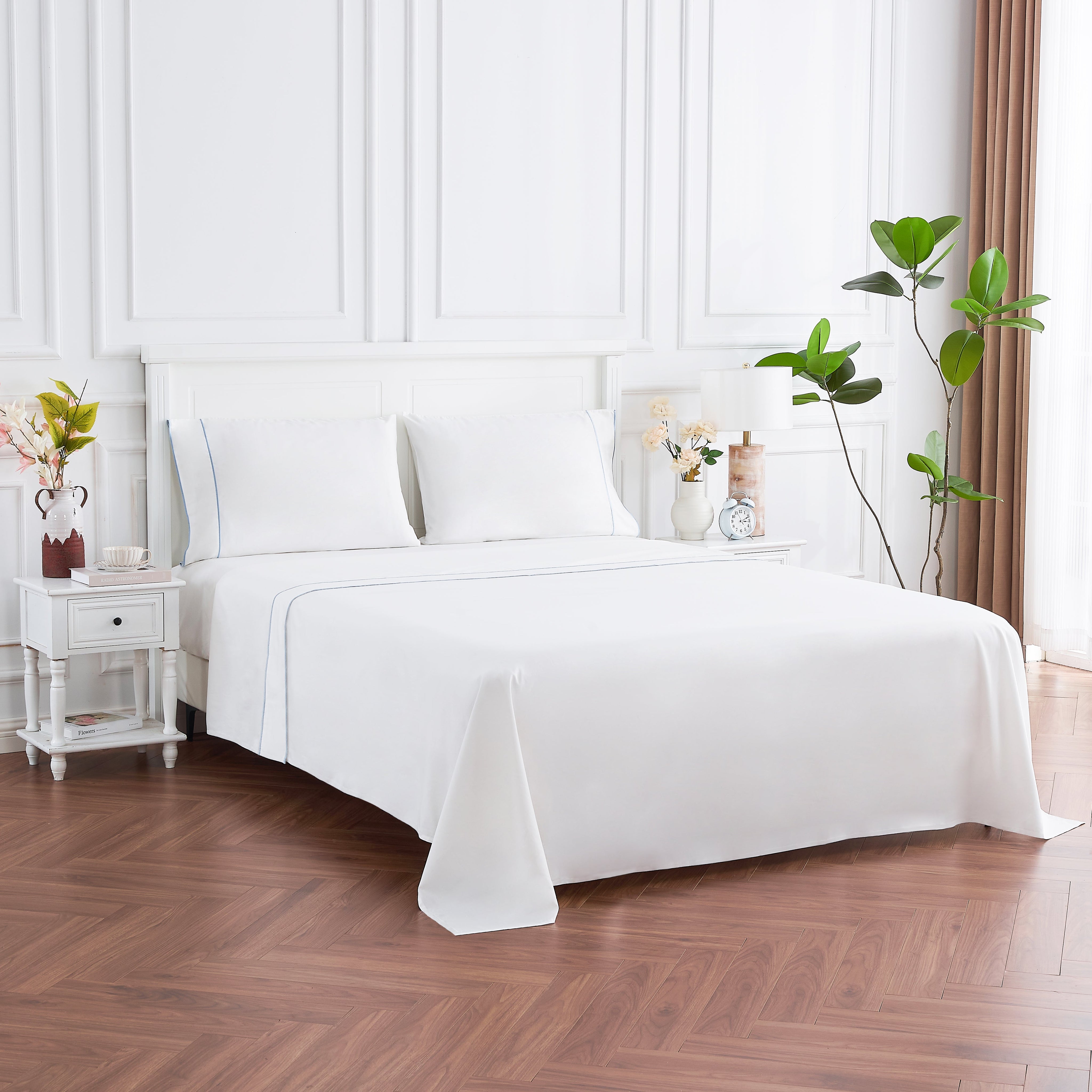 Our 600 thread count sateen sheet set is woven with extremely fine yet durable long staple cotton, producing an exceptionally smooth and soft sheet. We added an embroidered stripe edge to a simple framed embroidery for extra luxury and sophistication, and generously cut the fitted sheets to fit mattresses up to 18" deep. Exceptional quality and elegance, all at a comfortable price.