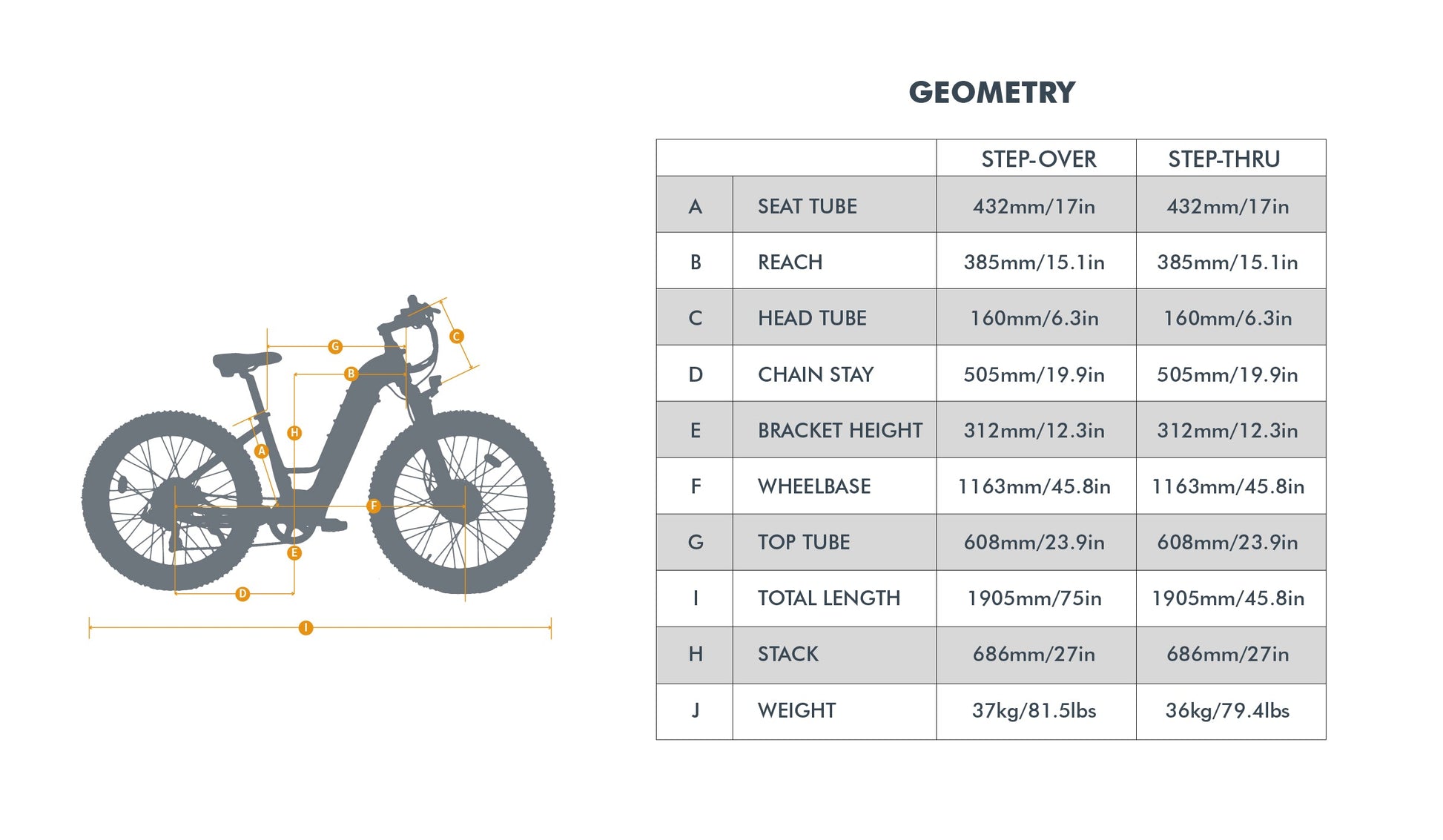 Weight: Step-over 81.5 lbs, step-thru 79.4 lbs