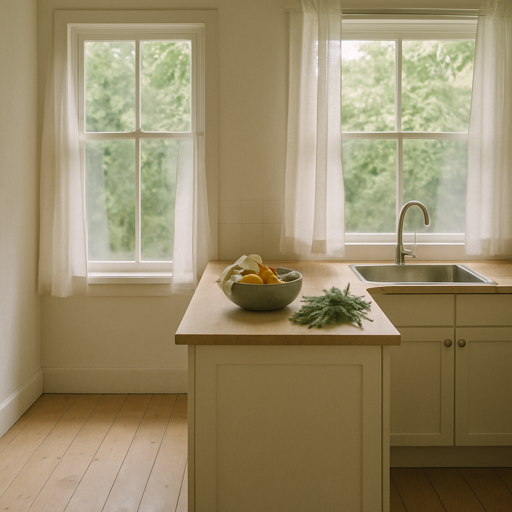 The kitchen before was warm and close, the windows sealed, air still above the tile. The door creaked open into a brighter space—cooler, aired-out, quiet. The floors were wide planks of pale wood, brushed clean, with a faint give beneath bare feet. The windows here were open. Outside, leaves moved just enough to stir the gauzy curtain hems, and the scent that entered was green, sharp, slightly bitter, edged with the tang of crushed stems.